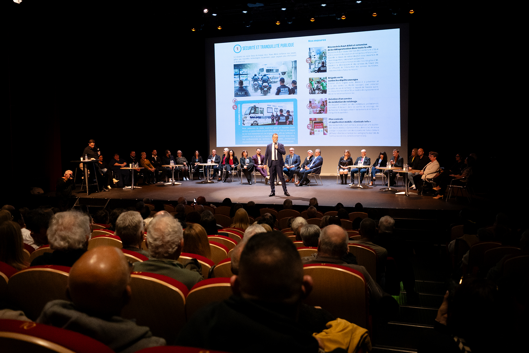 Face à cette union de la droite et de l’extrême droite, Rémi Esnault, soutenu par les communistes et Place publique, n’hésite pas à jouer la surenchère en matière de sécurité. Lors de son meeting, sous les applaudissements d’une salle comble, l’homme en costard entre en scène telle une rock star au rythme de « Free From Desire ». Nommant un par un ses colistiers, et rendant hommage à René Raimondi, qui termine son discours par un solennel « Je vous aime à jamais », Rémi Esnault égrène les 80 mesures de son programme. En tête : « sécurité et tranquillité publique », avec l’annonce d’une nouvelle brigade de police à moto, alors que Fos-sur-Mer bat déjà des records nationaux d’effectifs de police municipale au prorata du nombre d’habitants. C’est ensuite que vient la santé, avec sa proposition de créer un complexe médical pluridisciplinaire, ou encore « une résidence séniors autonomes ».