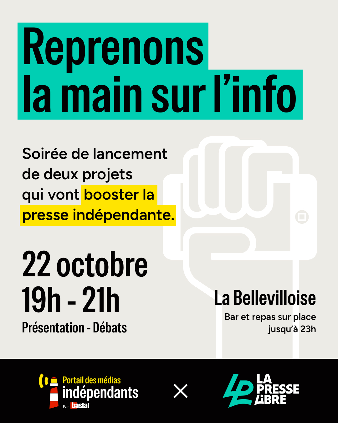 Ce 15 octobre, Basta! lance le Portail des médias indépendants pour rendre visible la presse indépendante. Une autre plateforme d’abonnement commun à huit médias indépendants verra également le jour, La Presse libre. Quand l’une est une alternative à Google Actualités, l’autre est plutôt un Netflix des médias indépendants. Ensemble, nous organisons une soirée spéciale le mercredi 22 octobre à la Bellevilloise (Paris 20e).