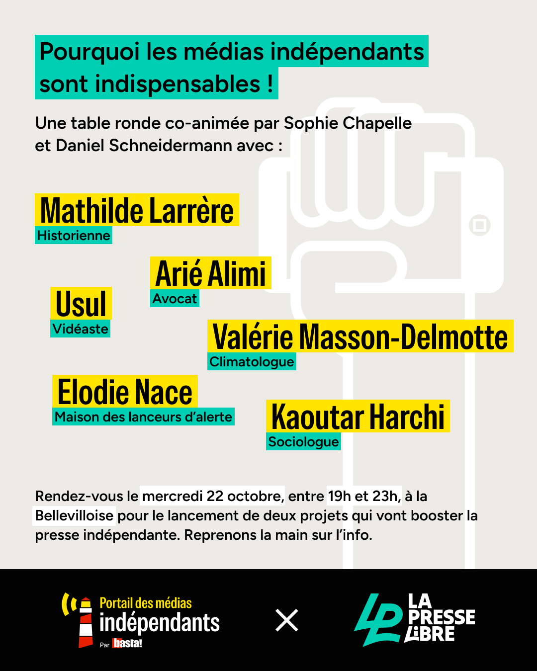 À 19h, notre journaliste Sophie Chapelle et Daniel Schneidermann, de la Presse libre et fondateur d’Arrêt sur Images, animeront une table ronde sur le thème « Pourquoi les médias indépendants sont indispensables ! » avec :