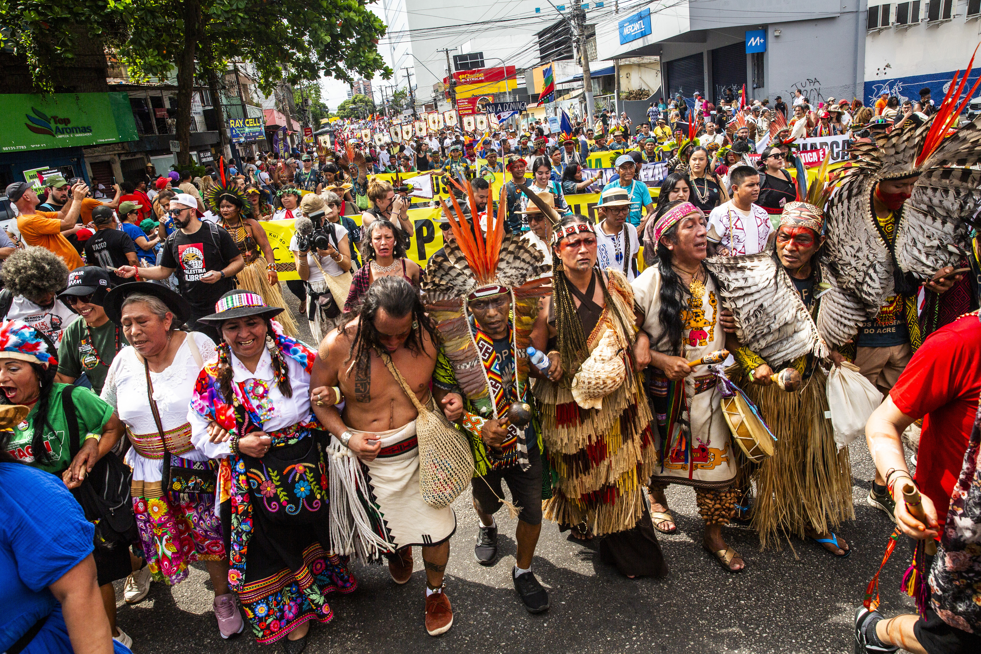 Les organisations autochtones investissent également les autres espaces qui accompagnent le sommet climatique : la Cúpula dos Povos, sommet des peuples, qui a lieu en parallèle de la COP, et l’espace dédié aux ONG et aux entreprises.